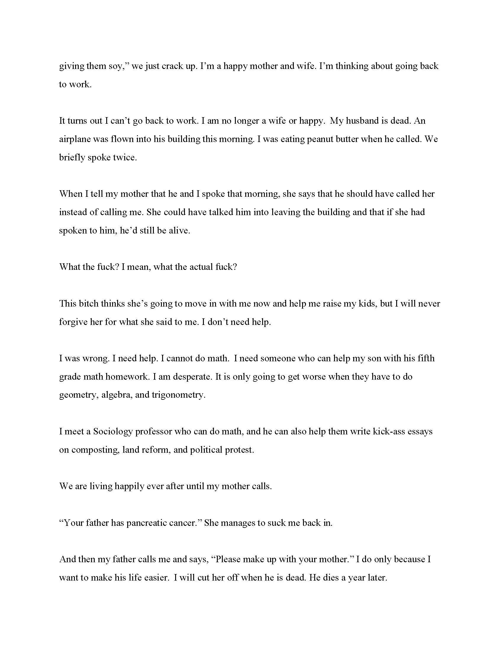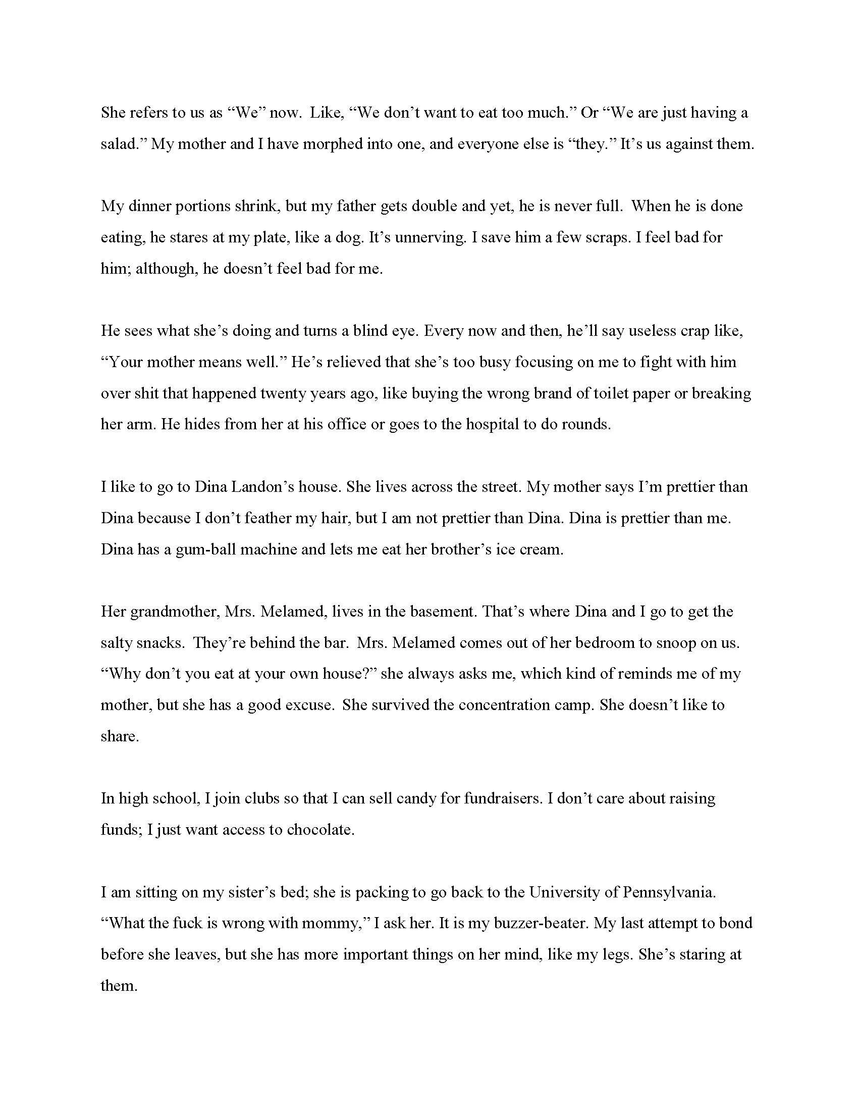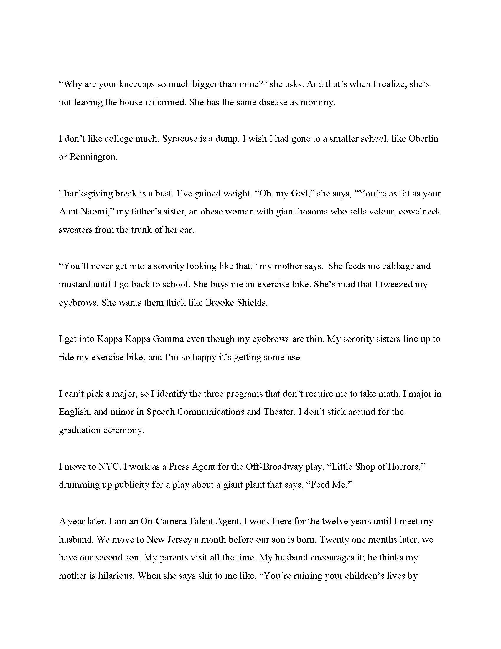 BIO: Meg Bloom Glasser was a Press Agent for Broadway and Off-Broadway Theater as well as an On-Camera Commercial TV Talent Agent in NYC. Her work was read at Tuesdays@9Naked Angels NYC and her play, The Potter, was in the Asbury Park Short Play Fringe Festival. Her short story, The Edge, was published in The Invisible Tattoo: True Stories About Children Grieving, Living and Loving After Loss. Her most recent short story, On Fire, was published in The Progenitor and nominated for a Pushcart Award.