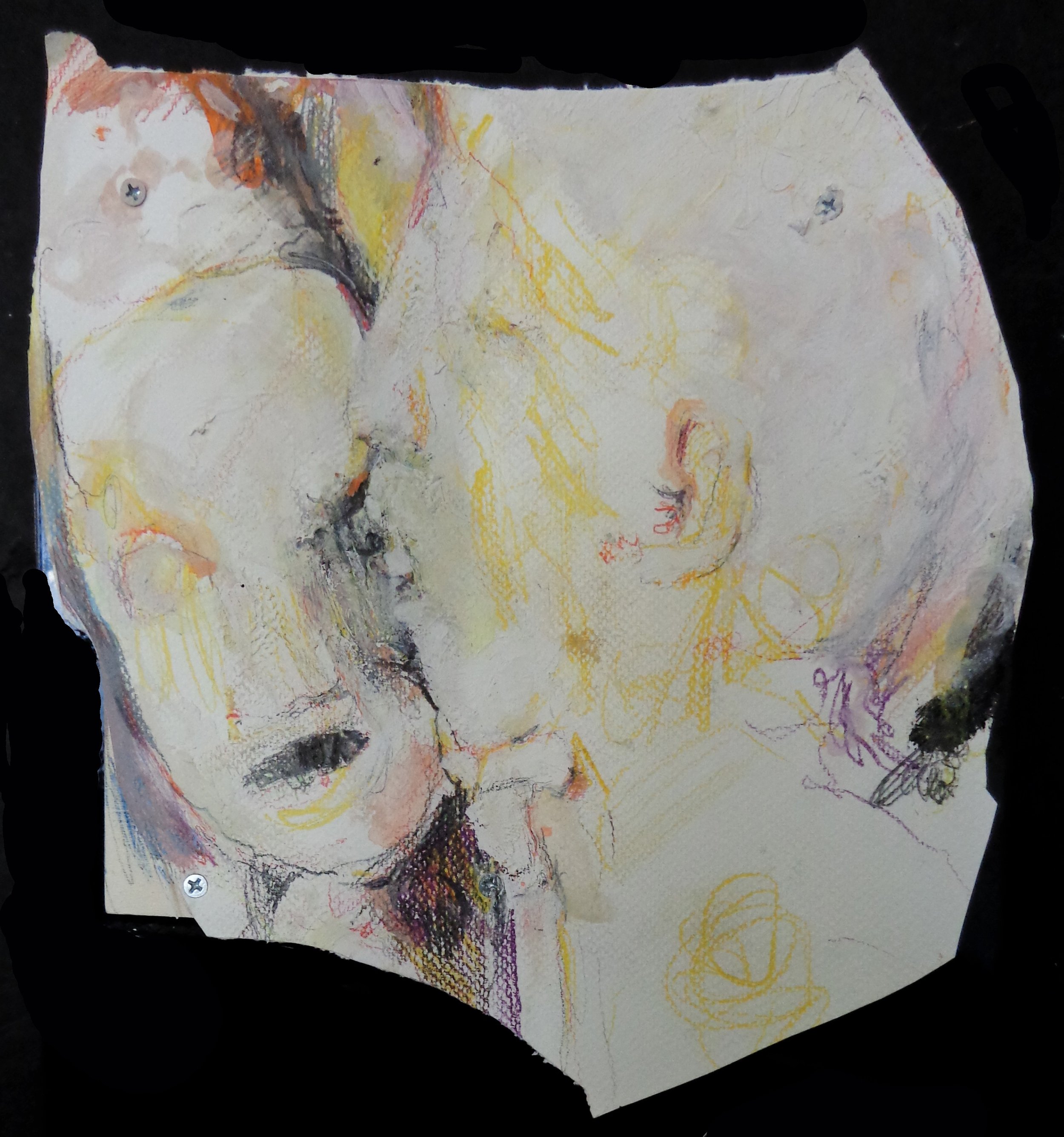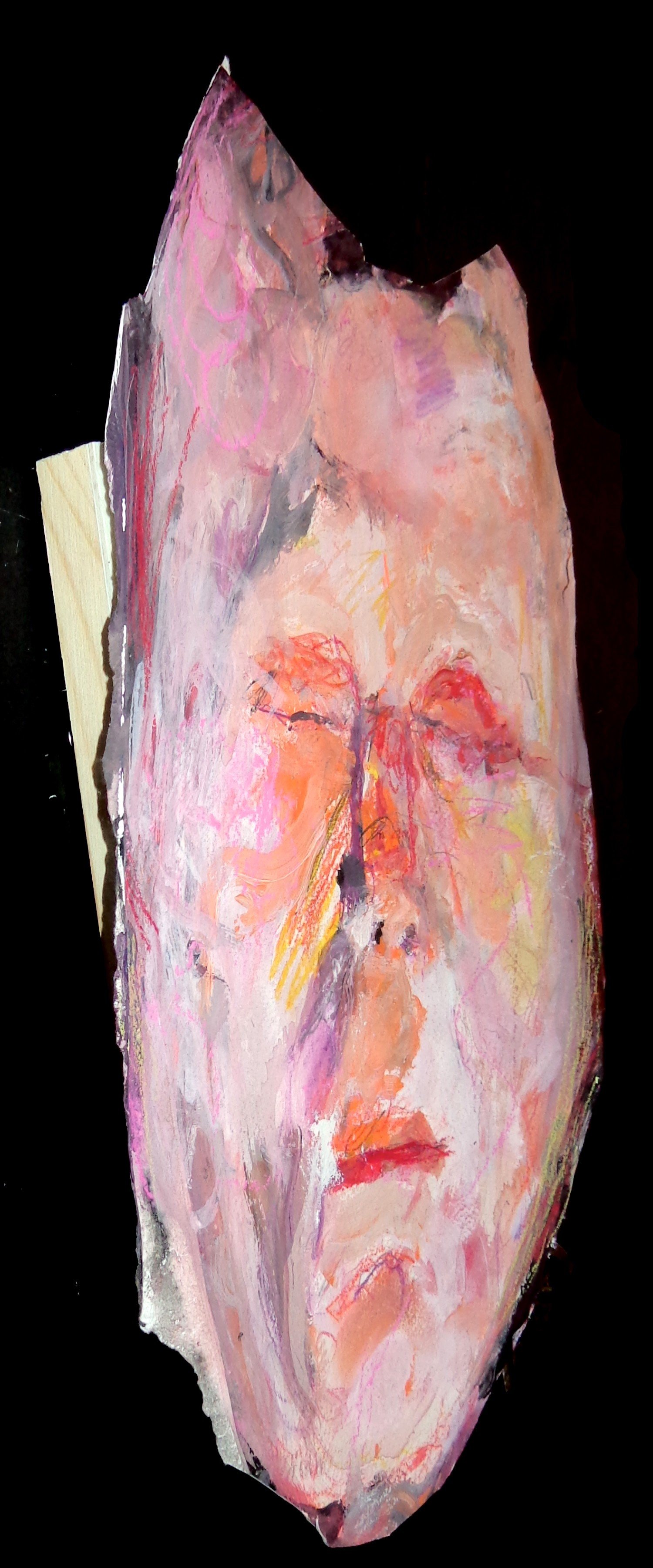 Dyker mashed head 1 (sideview), 15 x 19 1/2", (at greatest length), gouache, pencil, acrylic on paper mounted on board with screws, 2025