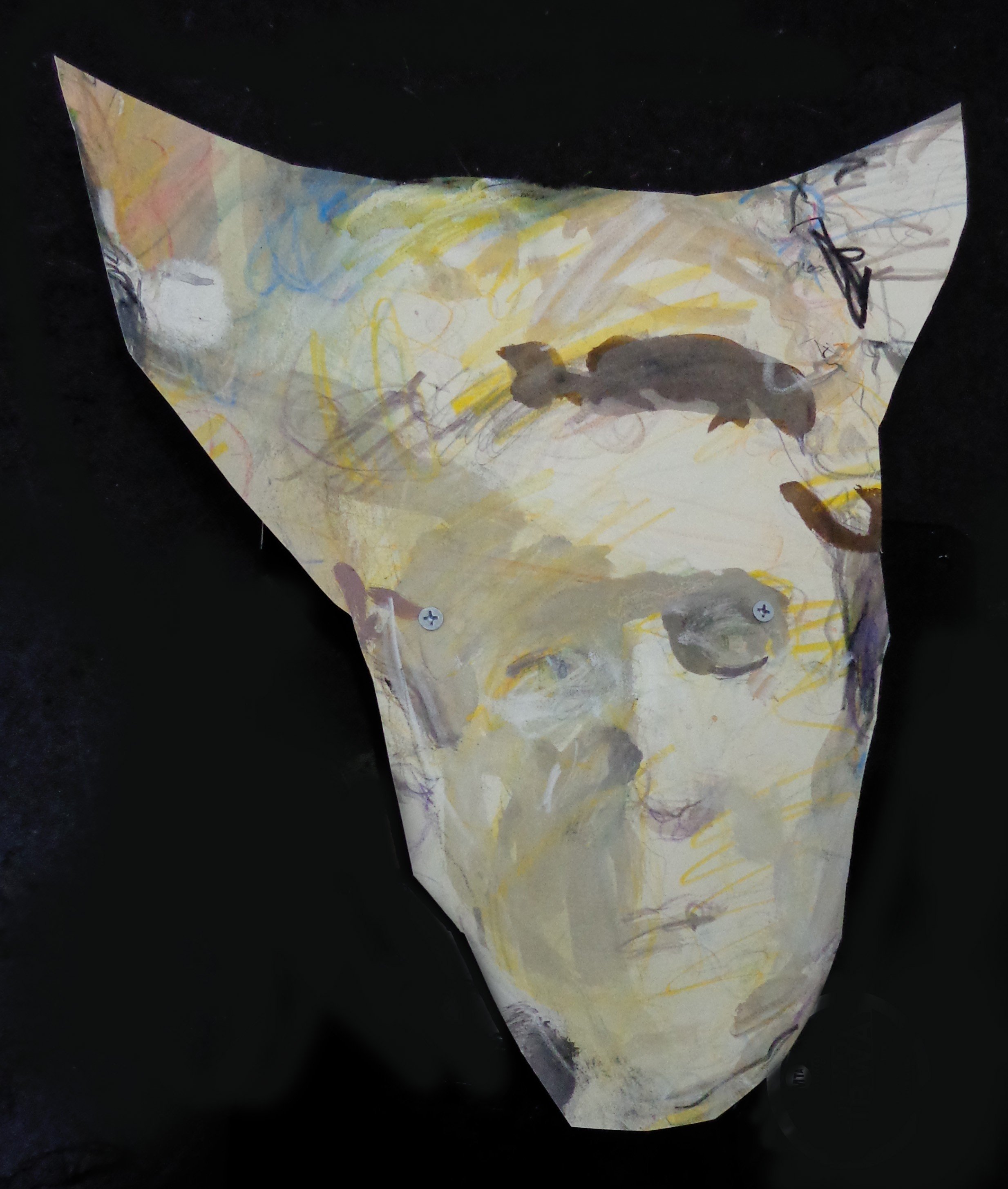 Met bust with horns (side view), 13 1/2" x 17", (at greatest length) gouache, pencil, acrylic and screws on board and paper, 2026