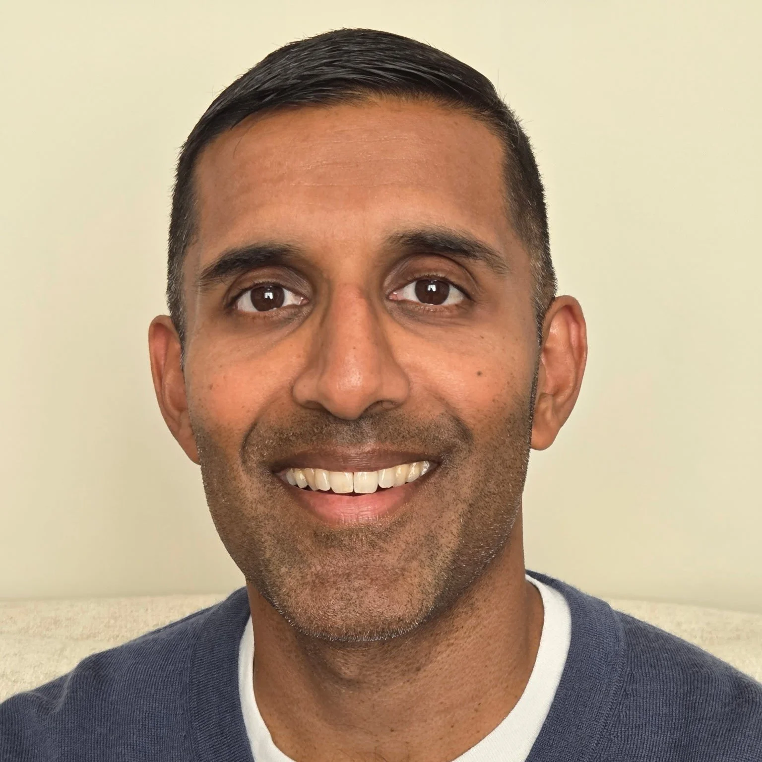In walks a man about my age, no, maybe younger, early to mid-40s. His hair is black apart from the tufts of grey on his temples. He’s got a stethoscope around his neck, wearing wrinkled, blue scrubs.