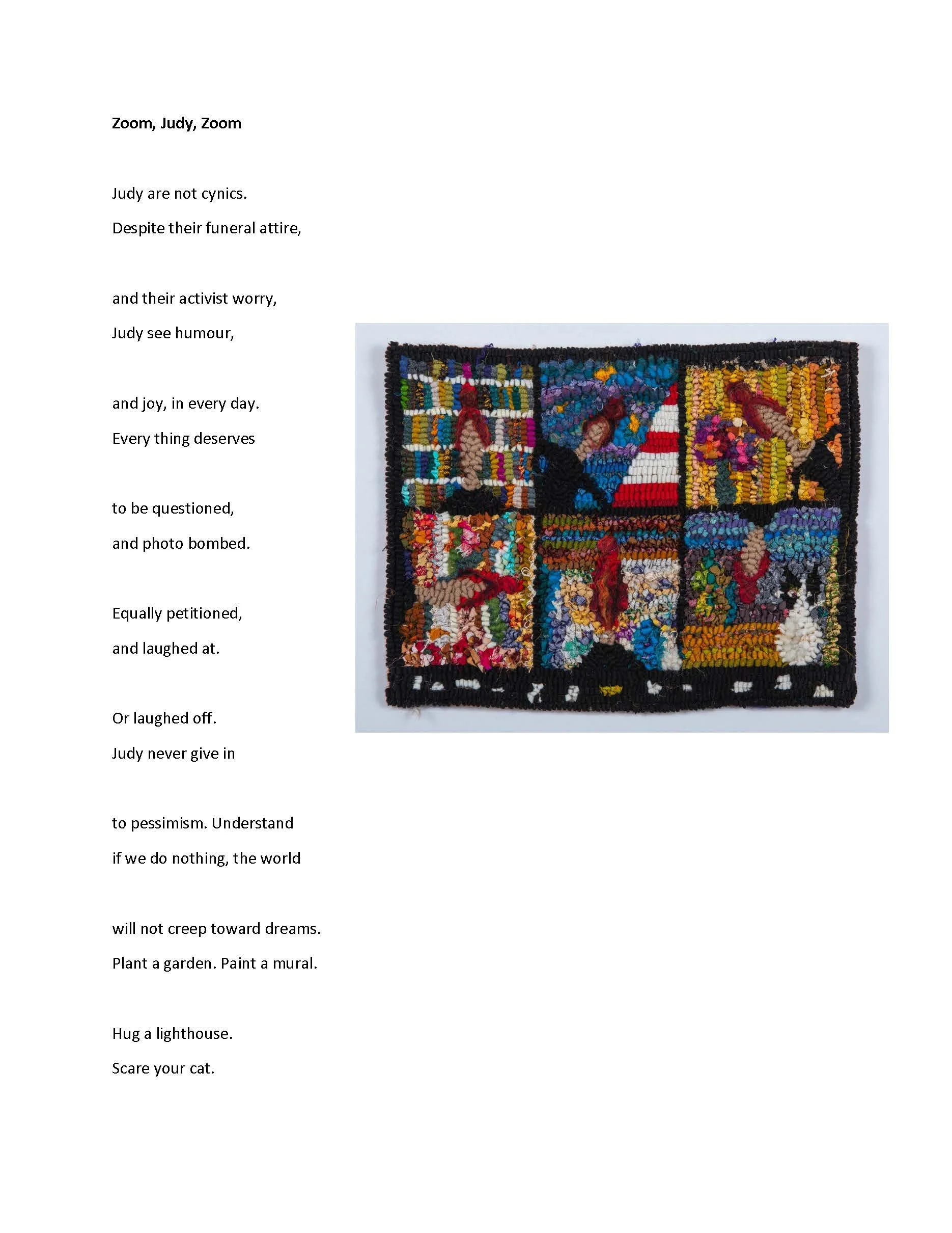 judy for justice: “zoom, judy, zoom” Writer-in-ResidencePoetry Oct 9 Written By David Estringel by Jordan Trethewey (art by Laura Kenney) David Estringel