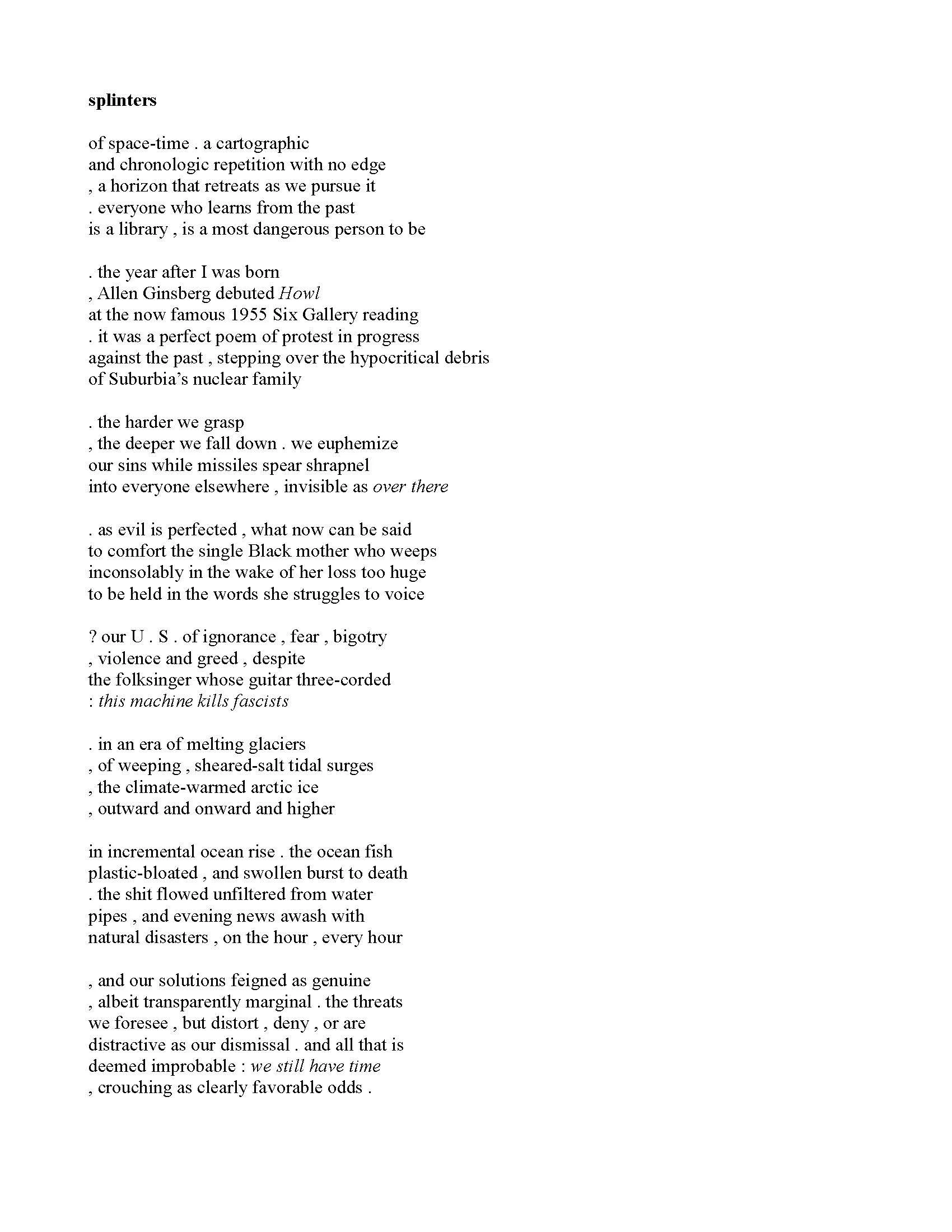 BIO: henry 7. reneau, jr. writes words of conflagration to awaken the world ablaze, an inferno of free verse illuminated by his affinity for disobedience & a barbwired conviction that prequels the spontaneous combustion that blazes from his heart, phoenix-fluxed red & gold, like a discharged bullet that commits a felony every day, exploding through change is gonna come to implement the fire next time. He is the author of the poetry collection, freedomland blues (Transcendent Zero Press) and the e-chapbook, physiography of the fittest (Kind of a Hurricane Press.) His work is published in Superstition Review; TriQuarterly; Prairie Schooner, Notre Dame Review; Punt Volat; The Ana; and Oyster River Pages. His work has also been nominated multiple times for the Pushcart Prize and Best of the Net.
