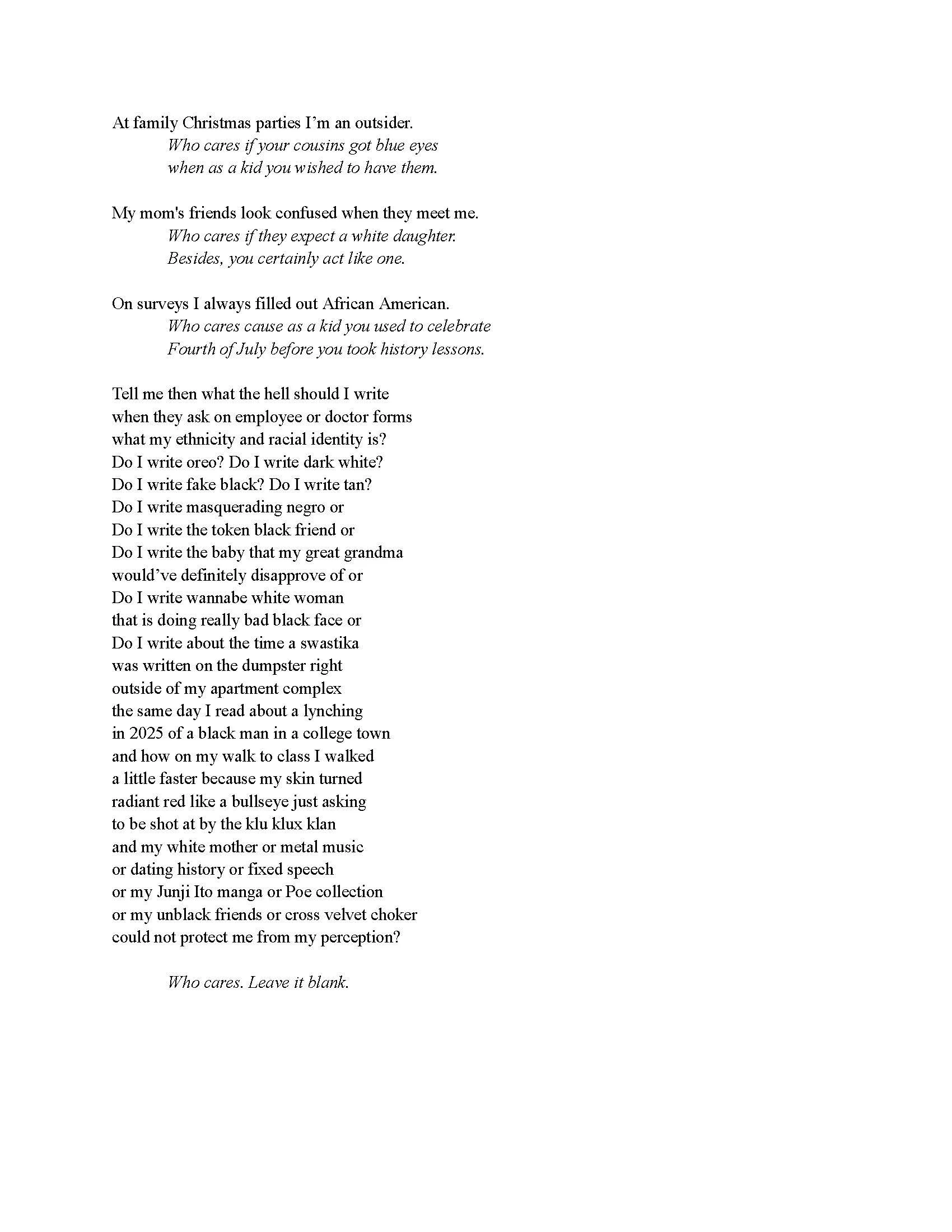 BIO: Annie Williams is a writer from Fraser, Michigan that graduated from Oakland University with her B.A. in Creative Writing and is currently pursuing her MFA at Bowling Green State University. She has three poetry collections, her latest being ‘Metal Poetry.’ Her work has also appeared in other places such as Fatal Flaw Literary Magazine, Sigma Tau Delta Rectangle, Broken Antler Magazine, Querencia Press, Flash Phantoms, Nightmare Melodies, and many more. When she is not writing she is either rocking out at a concert or staying at home watching a horror movie.